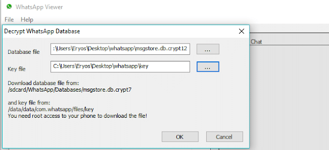 Figura 17: Se le pasa la base de datos y la key a WhatsApp Viewer Esto generará una base de datos la cual la volveremos abrir con WhatsApp Viewer, y nos permitirá acceder a las conversaciones, también estas se podrán exportar a otro tipo de archivos.