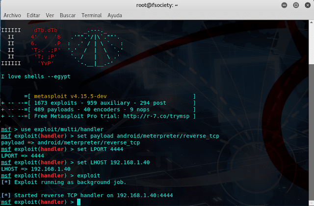 Ahora vamos a utilizar Metasploit Framework, configuramos Metasploit con nuestros datos para poder escuchar la petición del payload, esta cuando se ejecute en el dispositivo aparecerá la sesión.