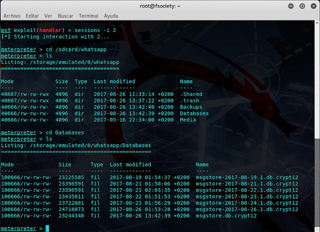 Una vez dentro del dispositivo de la víctima, vamos a ir al directorio de WhatsApp en Android. Yo, por defecto, lo tengo ubicado en la sdcard.