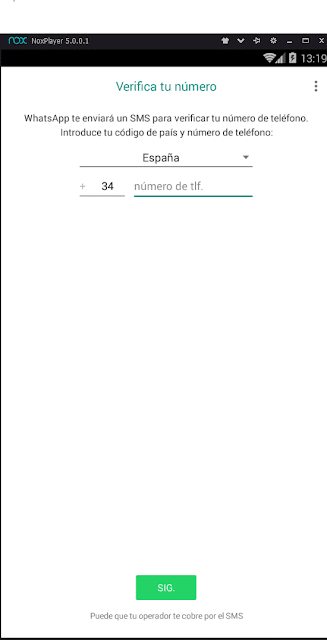 Ahora abrimos WhatsApp para Android en el emulador e introducimos el numero de teléfono del objetivo para hacer el proceso de registro.