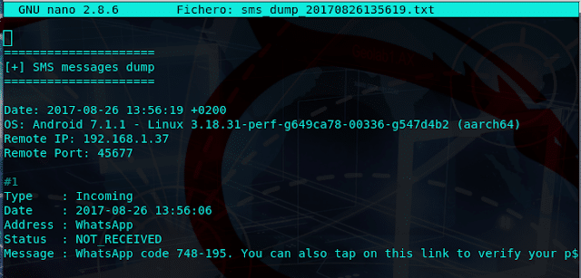 Necesitamos el código de verificación SMS de registro, así que volvemos a la sesión que tenemos de Metasploit, descargamos los mensajes SMS y lo abrimos con un editor de texto. Yo utilizaré nano.
