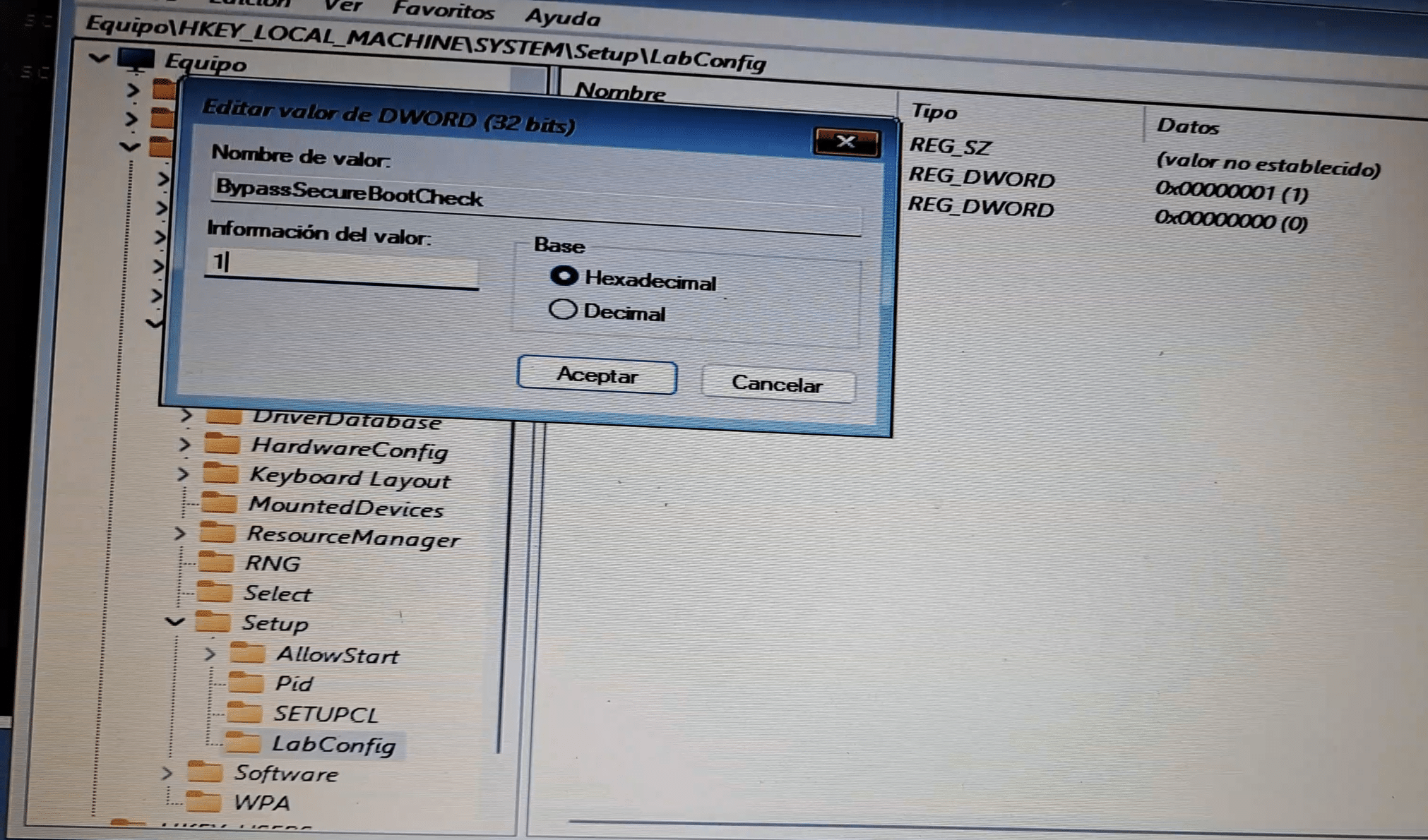Creamos 2 archivos, Damos click derecho dentro de la ventana>nuevo>valor de DWORD (32 BITS) y el primer archivo se llamara; "BypassTPMCheck" y el segundo "BypassSecureBootCheck".